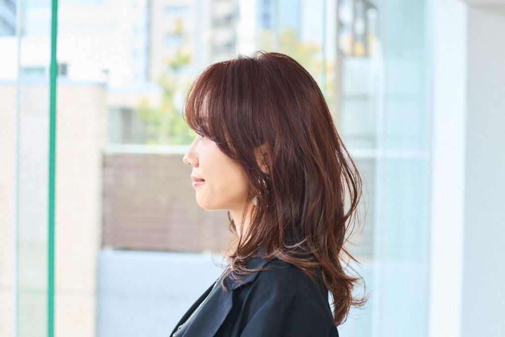 「やや硬めの髪質で、毛量も多いので広がりやすいタイプ。ボブベースのミディアムなのですが、巻いた時や結んだときに動きを出しやすいよう、トップ部分のみにレイヤーを入れています。とはいえ毛先は重めに残して今っぽい印象はキープ。顔周りにも適度にレイヤーを入れ、後れ毛を作っています。そのレイヤーを生かし、耳の横を少し膨らませて首元ですぼまるようなひし形シルエットに整えることで、縦ラインを強調させ、丸顔をスッキリと見せることができます。前髪は丸顔を際立たせないよう、長め、かつ量を少なくすいて透け感を出して縦長シルエットに整えています」